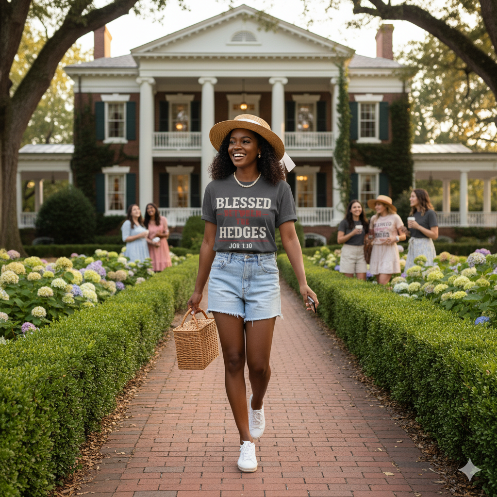 There’s something special about Saturdays in Athens, GA — where tradition runs deep and faith stands tall. The Blessed Between the Hedges Tee draws from Job 1:10, reminding us that God places a hedge of protection around those who trust Him.