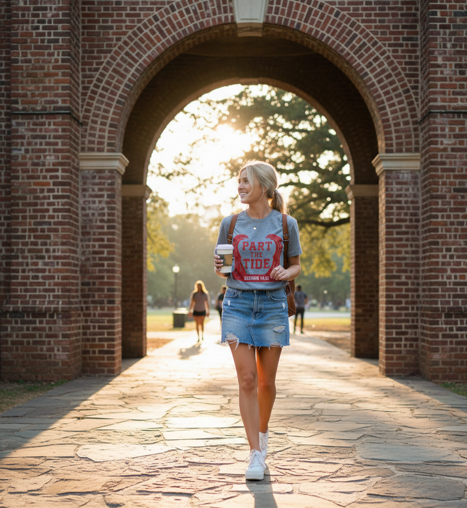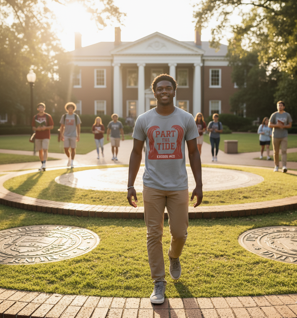 In Tuscaloosa, AL, the sound of game day is unmistakable — waves of energy, tradition, and pride that roll strong. The Part the Tide Tee takes its cue from Exodus 14:21, when Moses stretched out his hand and God parted the waters, making a way where there seemed to be none.